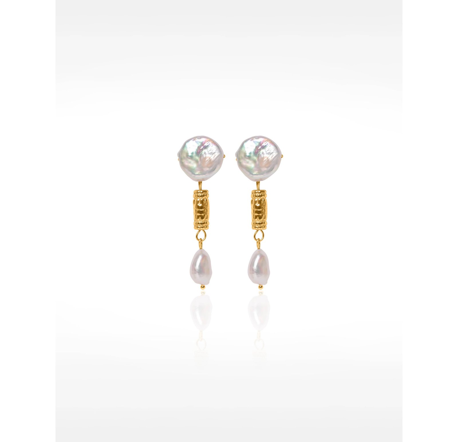 What we hear time and again is that the blend of large freshwater pearls with the ornate antique gold pearl creates such a modern style. The gold pearl makes the perfect link between the two baroque pearls and adds that sophisticated touch. Crafted in our Gloria Balensi workshop, this jewellery piece truly combines quality with originality. And because the stainless steel is perfectly water-resistant, you'll keep them for years without losing that golden lustre.