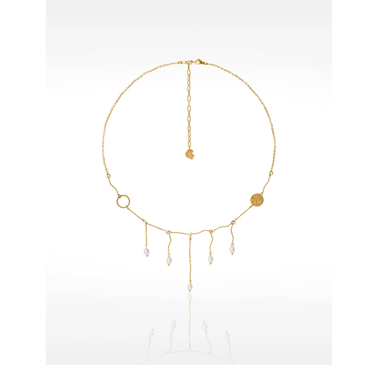 What we love first about this necklace is this asymmetric play that catches the eye. Customers are often surprised by the hammered pendant on one side and the twisted ring on the other. These baroque pearls have this irregular natural shape that makes them so special. What's more, in the centre, these five golden stems of different lengths create a truly unique cascade. Many choose it because it transforms a simple outfit into something sophisticated.