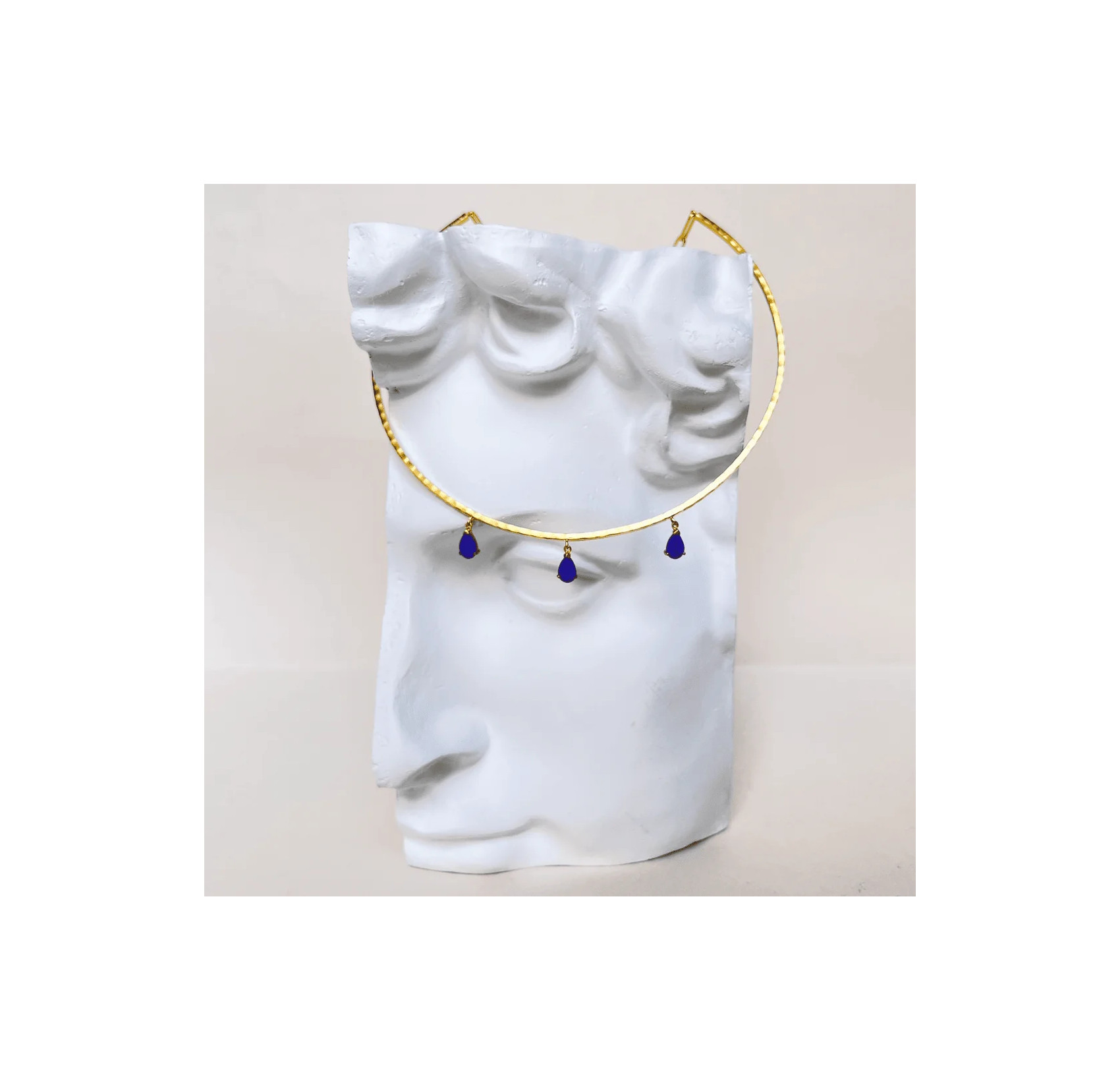 Emblematic piece of the collection, the NAYA torque necklace has been designed to make you unique. This lightly hammered jewel is adorned with three fine stones set in Lapis lazuli and a chain fastening allowing to dress finesse a bare back. A must-have that will seduce women looking for a modern trendy jewel.