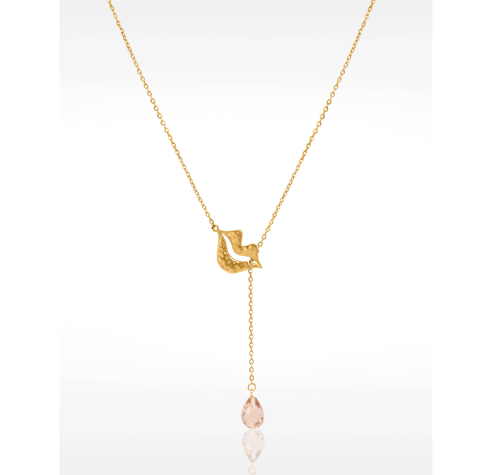 What captivates us is this hammered lip pendant that never goes unnoticed. This little peach morganite briolette suspended catches the light remarkably and truly gives this jewellery dimension to the jewellery. Peach morganite brings this warm and nurturing energy, stimulating creativity and self-expression, which explains why so many clients tell us they feel inspired and fulfilled wearing it. What makes the difference is this asymmetrical design where the chain passes through the pendant, creating this modern effect that stands out from the ordinary.