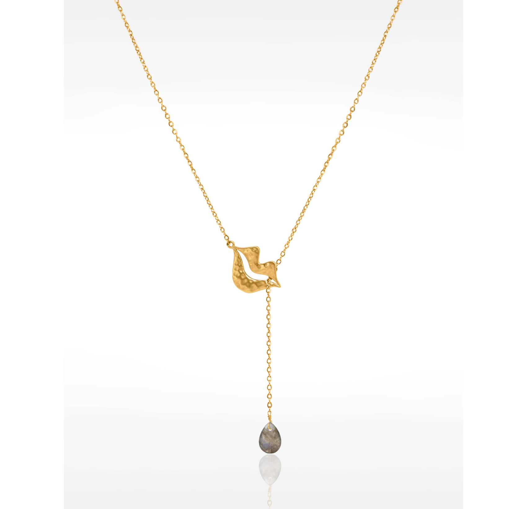 What we absolutely love about this necklace is that wonderfully original hammered mouth pendant. The pear labradorite stone hangs without a setting, which allows it to capture and reflect light in the most magnificent way. This labradorite really does help reveal your hidden potential and naturally stimulates intuition. Customers are always amazed by that cascading light effect that changes with every movement.